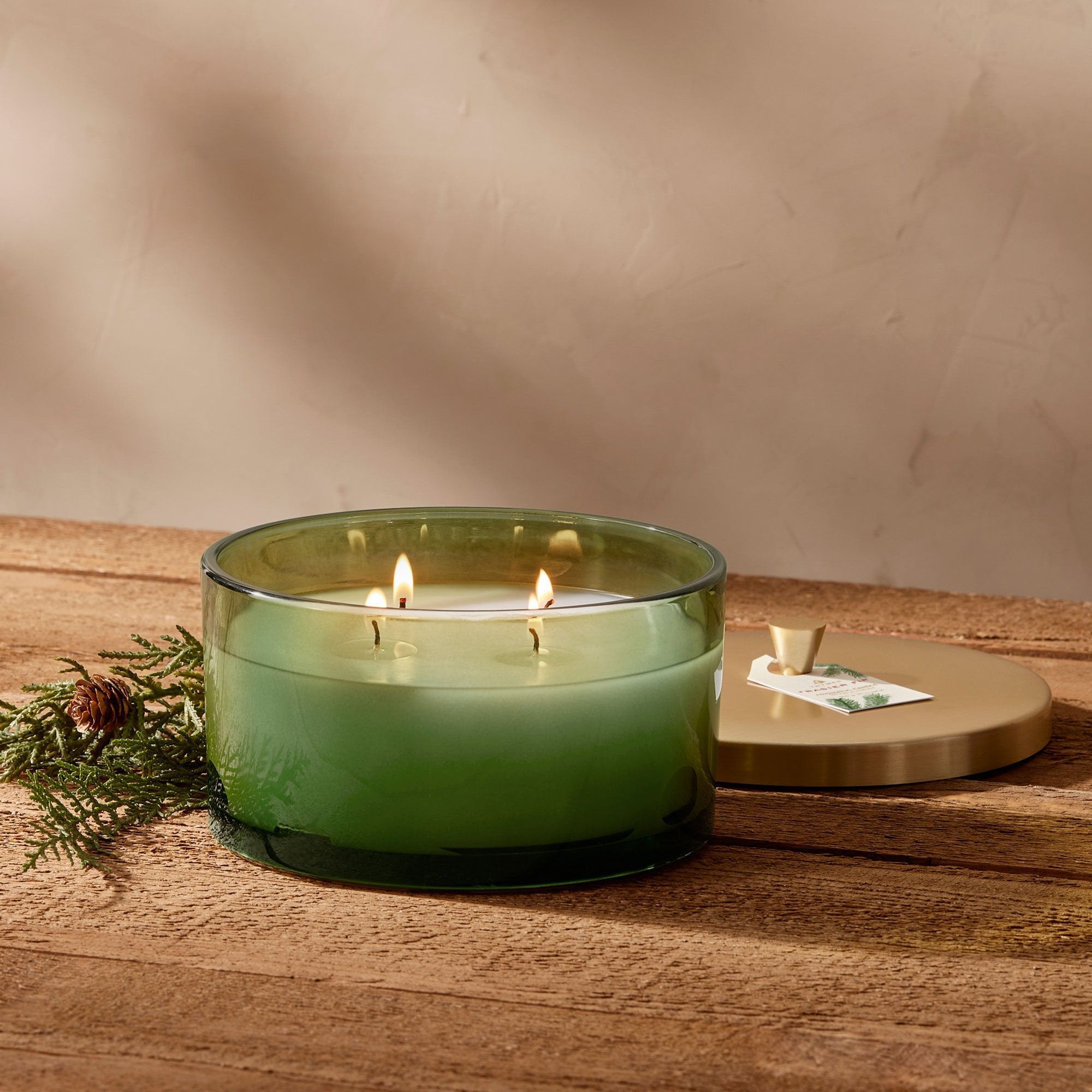 An impressive and stunning centerpiece for your home, experience the beloved Frasier Fir fragrance with this 4-Wick candle. Fragrance notes of Siberian fir, cedarwood, and sandalwood come to life with this deep green glass vessel, topped with a brushed gold lid and hang tag.