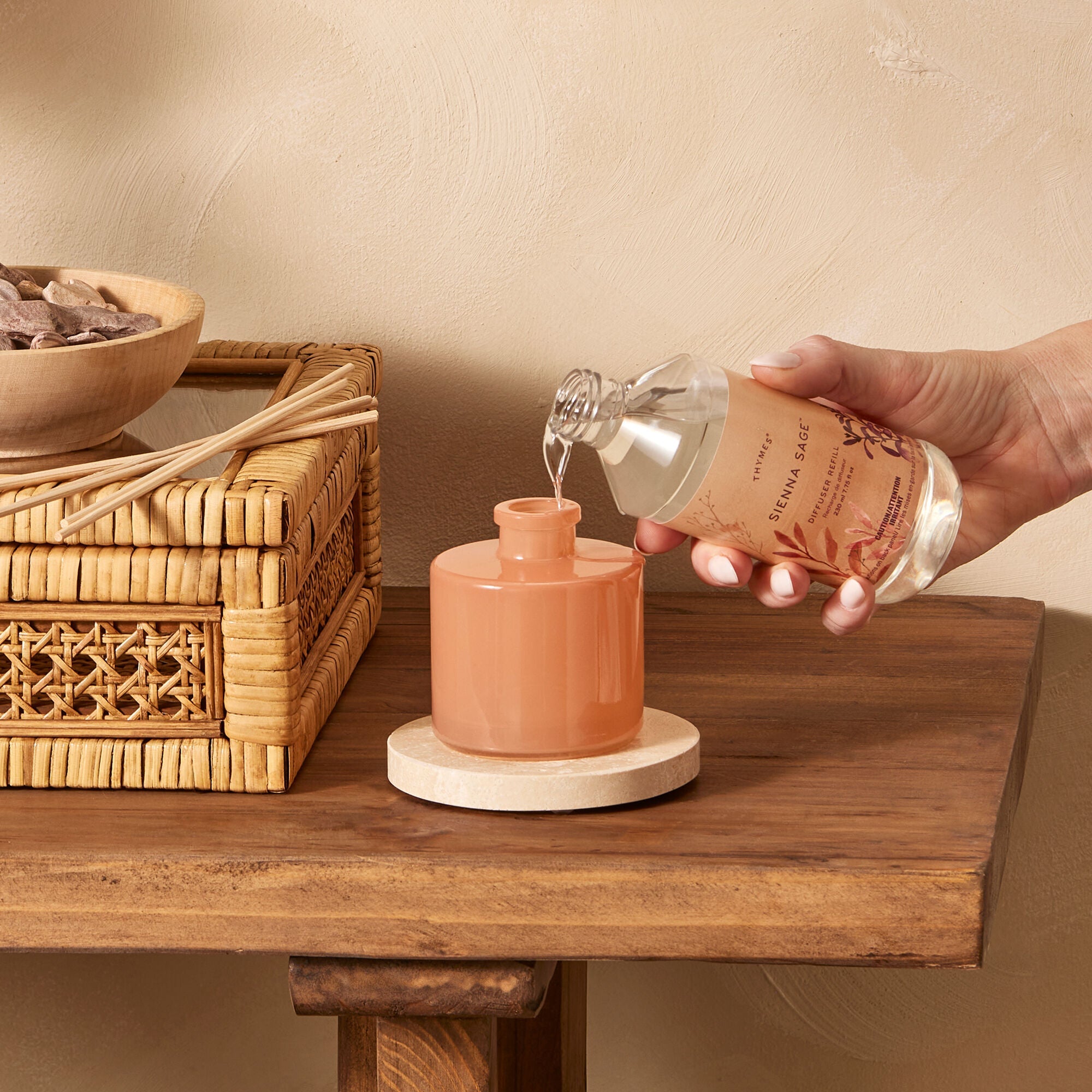 Refresh your Petite Reed Diffuser with Sienna Sage Diffuser Oil Refill and let fragrance notes of palo santo wood, amber, clary sage, benzoin resin, and green fig fill the air.