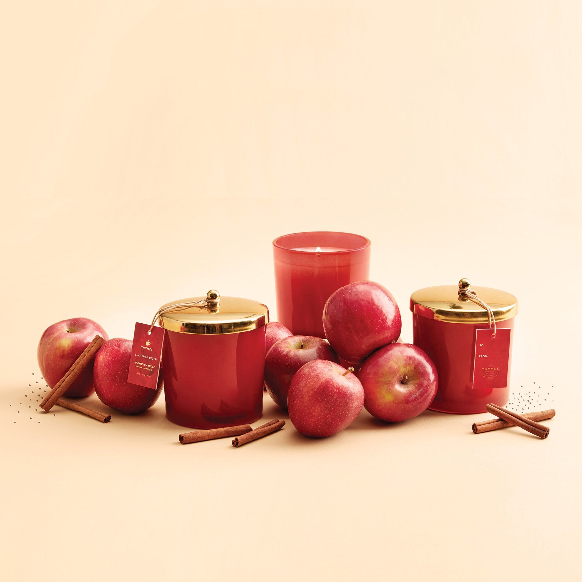 Cozy up to this apple-red candle bringing a rich, spicy scent that’s steeped in tradition. Complete with a gold lid, this makes for a modern home decor piece as the seasons change.